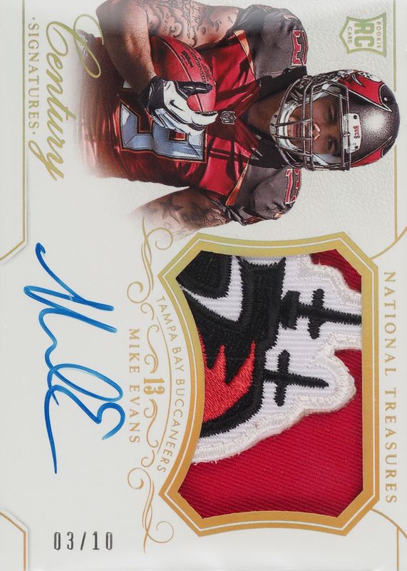 This card is 1 of 9 Mike Evans' card variations in the 2014 National Treasures set being tracked by Sports Card Investor, including Rookie Patch Auto /99, Rookie Patch Auto - Numbers (/13), Rookie Patch Auto - Silver /25, Rookie Patch Auto - Black /5, and Rookie Patch Auto - Blue /1.