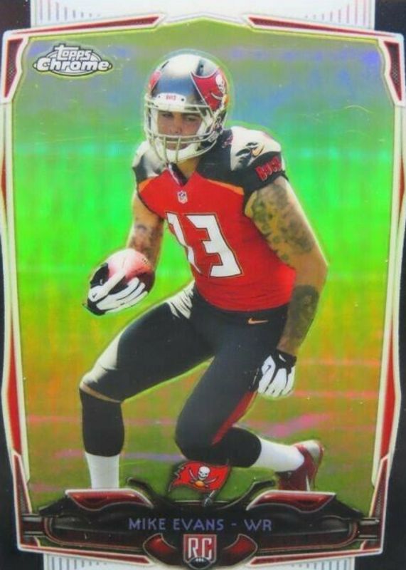 The Mike Evans 2014 Topps Chrome #185 Black Refractor /299 Rookie card in Raw condition has moved down -$10.00 (-9.1%) in the last 30 days and was last sold for $100.00 .