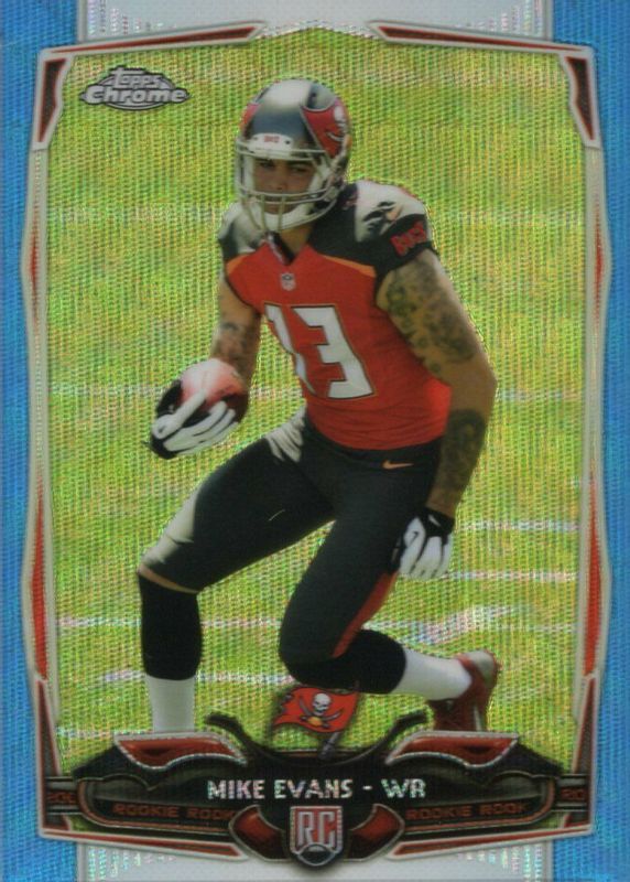 The Mike Evans 2014 Topps Chrome #185 Blue Wave Refractor Rookie card in Raw condition has moved down -$6.70 (-22.6%) in the last 30 days and was last sold for $22.99 .