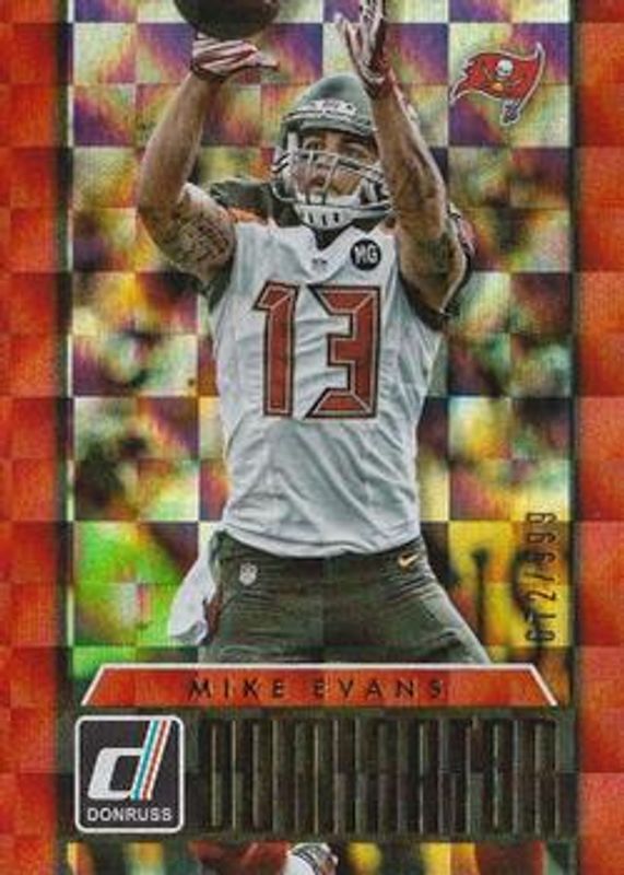 The Mike Evans 2015 Donruss #25 Dominator /999 card is 1 of 16 Mike Evans' card variations in the 2015 Donruss set being tracked by Sports Card Investor, including Base, Holofoil Backs, Red Foil, Stat Line Season /669, and Stat Line Career Green /562.