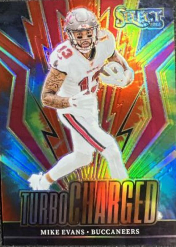 The Mike Evans 2023 Select #TUR-MEV Turbocharged - Tie-Dye /25 card in Raw condition has not changed in price in the last 30 days and was last sold for $29.99 .