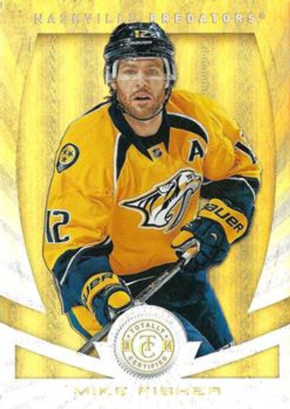 The Mike Fisher 2013 Totally Certified #117 Mirror Platinum Gold /5 card is 1 of 14 Mike Fisher's card variations in the 2013 Totally Certified set being tracked by Sports Card Investor, including Base, Platinum Red /100, Platinum Blue /50, Mirror Platinum Purple /35, and Mirror Platinum Red /25.