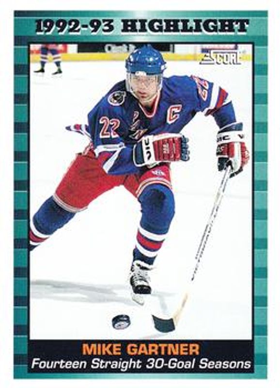 The Mike Gartner 1993 Score #447 Base card is 1 of 5 Mike Gartner's card variations in the 1993 Score set being tracked by Sports Card Investor, including #2 Base, #2 Samples, #46 Pinnacle All Stars U.S., and #8 Pinnacle All Stars U.S..