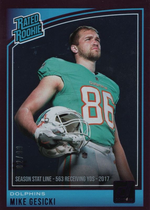 This card is 1 of 33 Mike Gesicki's card variations in the 2018 Donruss set being tracked by Sports Card Investor, including Base, Aqueous Test, Jersey Number (/86), Press Proof Blue, and Press Proof Green.