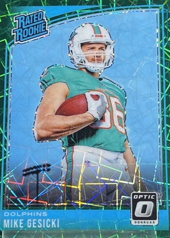 The Mike Gesicki 2018 Optic #187 Green Velocity Rookie card in Raw condition has not changed in price in the last 30 days and was last sold for $1.50 .