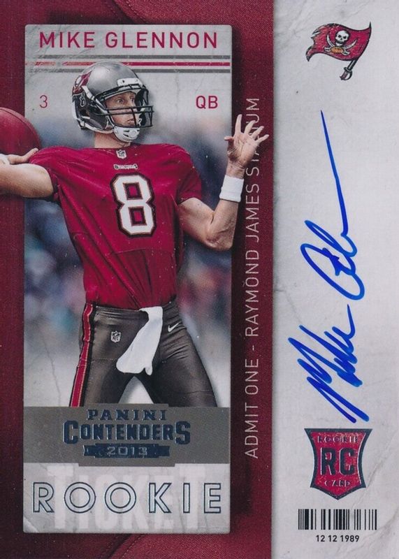 Mike Glennon's Football cards are available in at least 6 sets. Mike Glennon's biggest 7-day price movers are 2013 Contenders #228 Rookie Ticket Auto (Throwing), 2013 Prizm #272 Base, and 2013 Topps Chrome #218 Base.
