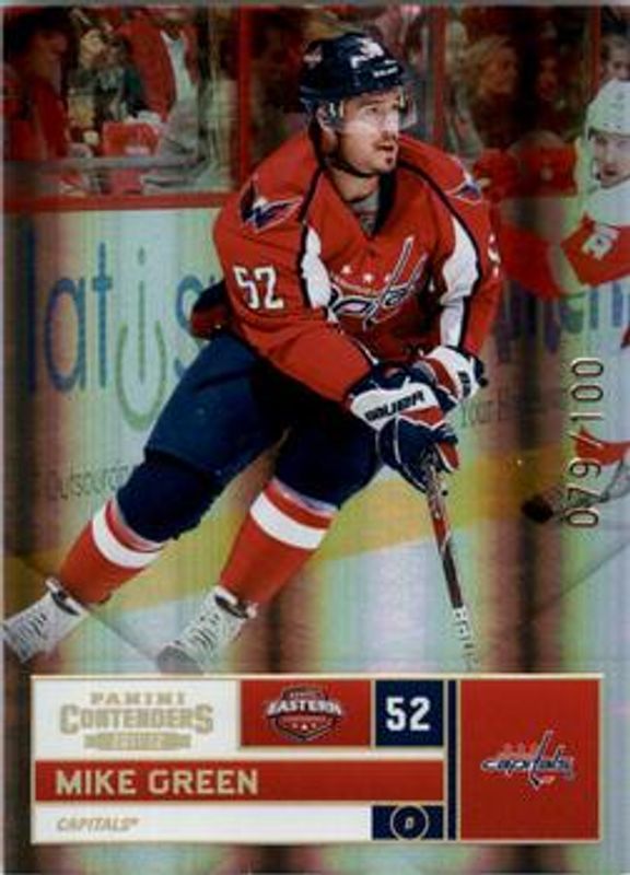 The Mike Green 2011 Contenders #52 Gold /100 card is 1 of 7 Mike Green's card variations in the 2011 Contenders set being tracked by Sports Card Investor, including Base /800, Black /1, Printing Plate Black /1, Printing Plate Cyan /1, and Printing Plate Magenta /1.