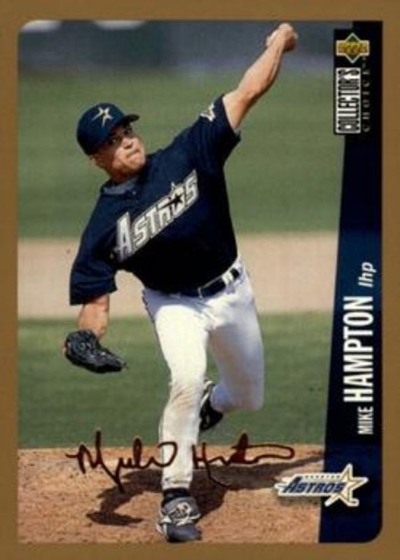 The Mike Hampton 1996 Upper Deck Collector's Choice #158 Gold Signatures card is 1 of 3 Mike Hampton's card variations in the 1996 Upper Deck Collector's Choice set being tracked by Sports Card Investor, including Base, and Silver Signatures.