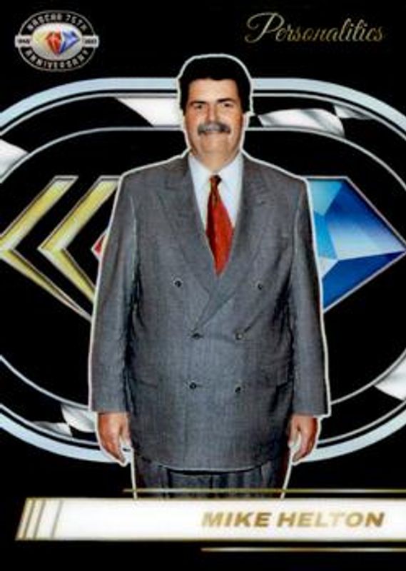 The Mike Helton 2023 Prizm NASCAR #61 NASCAR 75th Anniversary card is 1 of 3 Mike Helton's card variations in the 2023 Prizm NASCAR set being tracked by Sports Card Investor, including NASCAR 75th Anniversary - Gold /10, and NASCAR 75th Anniversary - Gold Vinyl /1.