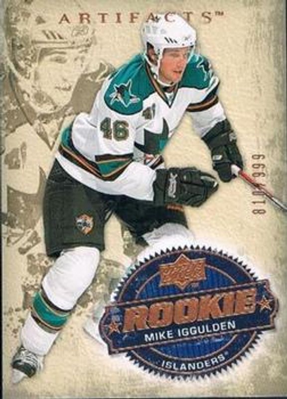 The Mike Iggulden 2008 Upper Deck Artifacts #213 Base /999 Rookie card is 1 of 6 Mike Iggulden's card variations in the 2008 Upper Deck Artifacts set being tracked by Sports Card Investor, including Gold /75, Blue /50, Copper Spectrum /25, Gold Spectrum /5, and Black Rainbow Autographs /1.
