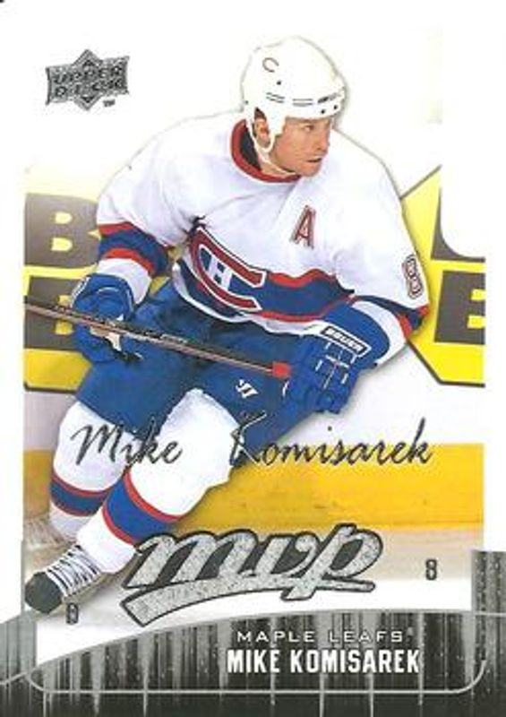 The Mike Komisarek 2009 Upper Deck MVP #30 Base card is 1 of 3 Mike Komisarek's card variations in the 2009 Upper Deck MVP set being tracked by Sports Card Investor, including Gold Script /100, and Super Script /25.