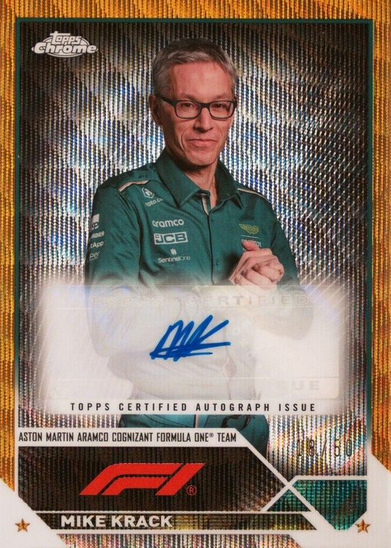 The Mike Krack 2023 Topps Chrome Formula 1 #CAC-MK Autographs - Gold Wave Refractor /50 card in Raw condition has not changed in price in the last 30 days and was last sold for $7.50 .