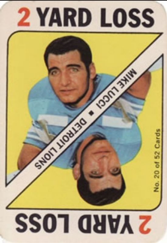 The Mike Lucci 1971 Topps #20 Game Inserts card is 1 of 2 Mike Lucci's card variations in the 1971 Topps set being tracked by Sports Card Investor, including Base.