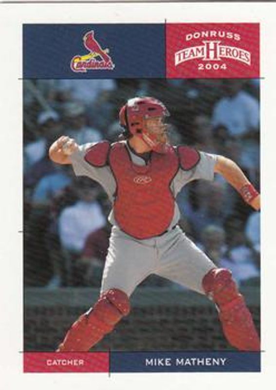 The Mike Matheny 2004 Donruss Team Heroes #398 Base card is 1 of 4 Mike Matheny's card variations in the 2004 Donruss Team Heroes set being tracked by Sports Card Investor, including Showdown - Bronze /150, Showdown - Silver /50, and Showdown - Gold /10.