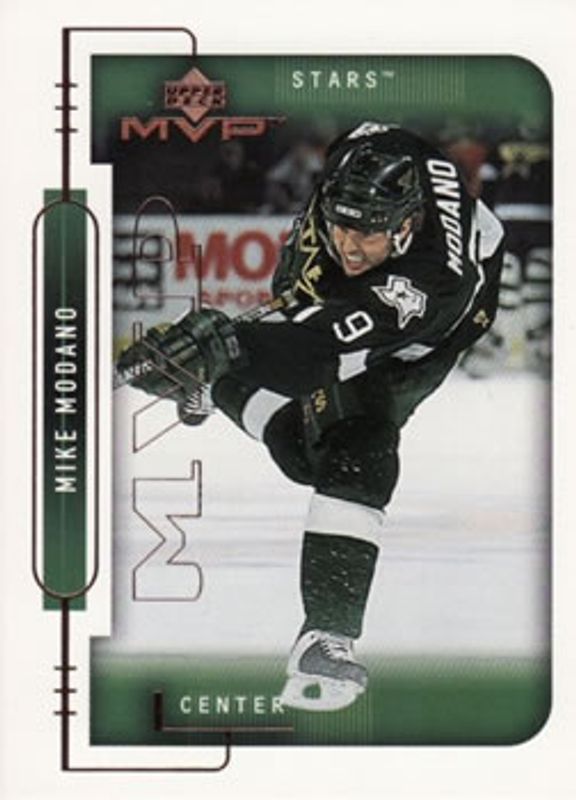 The Mike Modano 1999 Upper Deck MVP #59 Base card is 1 of 6 Mike Modano's card variations in the 1999 Upper Deck MVP set being tracked by Sports Card Investor, including Silver Script, Gold Script /100, Super Script /25, Hands of Gold, and MVP Talent.