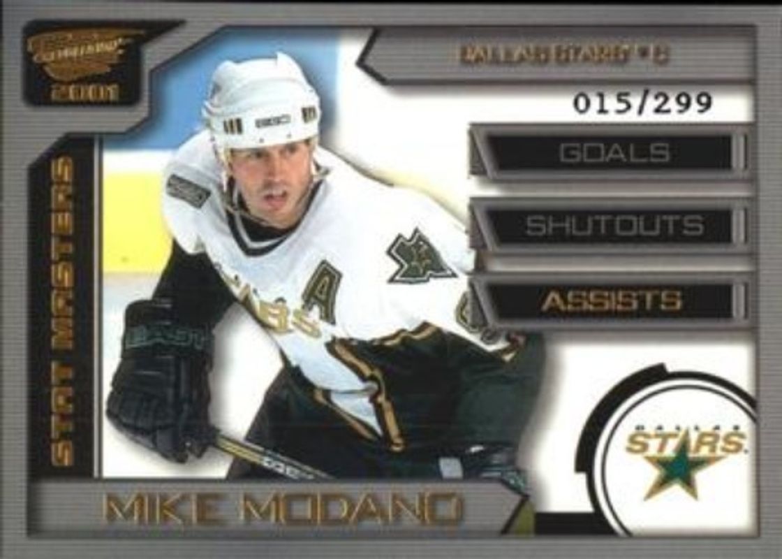 The Mike Modano 2000 Pacific Revolution #25 Stat Masters /99 card is 1 of 8 Mike Modano's card variations in the 2000 Pacific Revolution set being tracked by Sports Card Investor, including Base, Red /99, Shadow Series Blue /85, Premiere Date /60, and Ice Immortals.