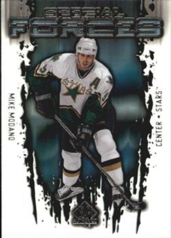 The Mike Modano 2000 SP Authentic #SF2 Special Forces card is 1 of 11 Mike Modano's card variations in the 2000 SP Authentic set being tracked by Sports Card Investor, including #29 Base /900, Autographed Replica Jersey Redemptions, #PS3 Parents' Scrapbook, #25 Buyback Autographs /154, and #27 Buyback Autographs /154.