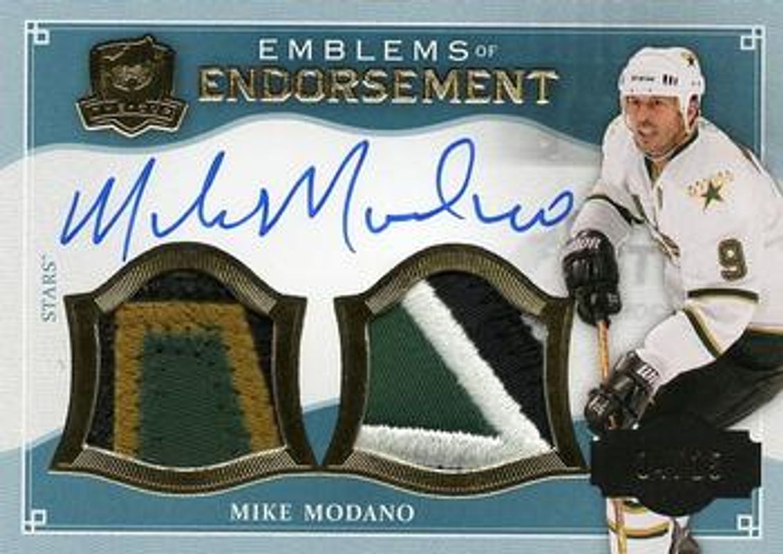 The Mike Modano 2013 Upper Deck The Cup #EE-MM Emblems of Endorsement /15 card is 1 of 6 Mike Modano's card variations in the 2013 Upper Deck The Cup set being tracked by Sports Card Investor, including Signatures Patches /99, Limited Logos /50, Cup Foundations Quad Patch /10, Foundations Patches Autographs /5, and Foundations Tags Autographs /1.