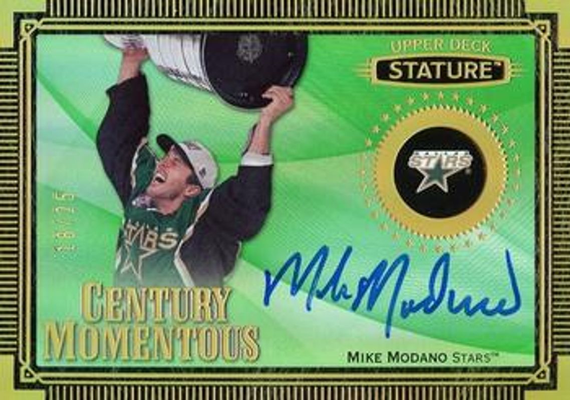 The Mike Modano 2020 Upper Deck Stature #CM-17 2019 Upper Deck Stature Update: Century Momentous Autographs - Green /25 card is 1 of 14 Mike Modano's card variations in the 2020 Upper Deck Stature set being tracked by Sports Card Investor, including 2019 Upper Deck Stature Update: Century Momentous Autographs, 2019 Upper Deck Stature Update: Autographs /199, 2019 Upper Deck Stature Update: Autographs - Green /65, 2019 Upper Deck Stature Update: Autographs - Red /35, and 2019 Upper Deck Stature Update: Autographs - Blue /10.