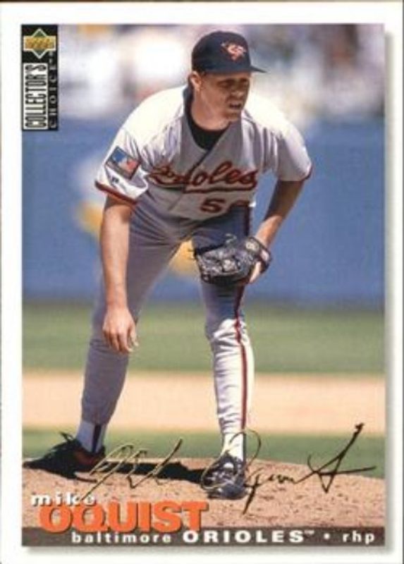 The Mike Oquist 1995 Upper Deck Collector's Choice #343 Gold Signatures card is 1 of 3 Mike Oquist's card variations in the 1995 Upper Deck Collector's Choice set being tracked by Sports Card Investor, including Base, and Silver Signatures.
