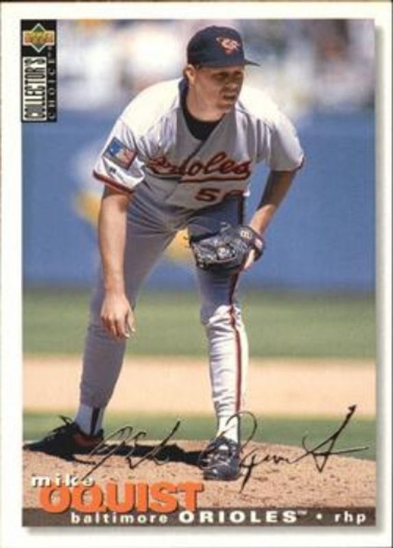 The Mike Oquist 1995 Upper Deck Collector's Choice #343 Silver Signatures card is 1 of 3 Mike Oquist's card variations in the 1995 Upper Deck Collector's Choice set being tracked by Sports Card Investor, including Base, and Gold Signatures.