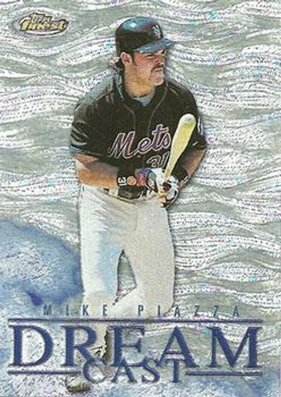 The Mike Piazza 2000 Topps Finest #DC8 Dream Cast card is 1 of 12 Mike Piazza's card variations in the 2000 Topps Finest set being tracked by Sports Card Investor, including #226 Base, #139 Base, #139 Gold Refractor /100, #226 Gold Refractor /100, and #BB2 Ballpark Bounties.