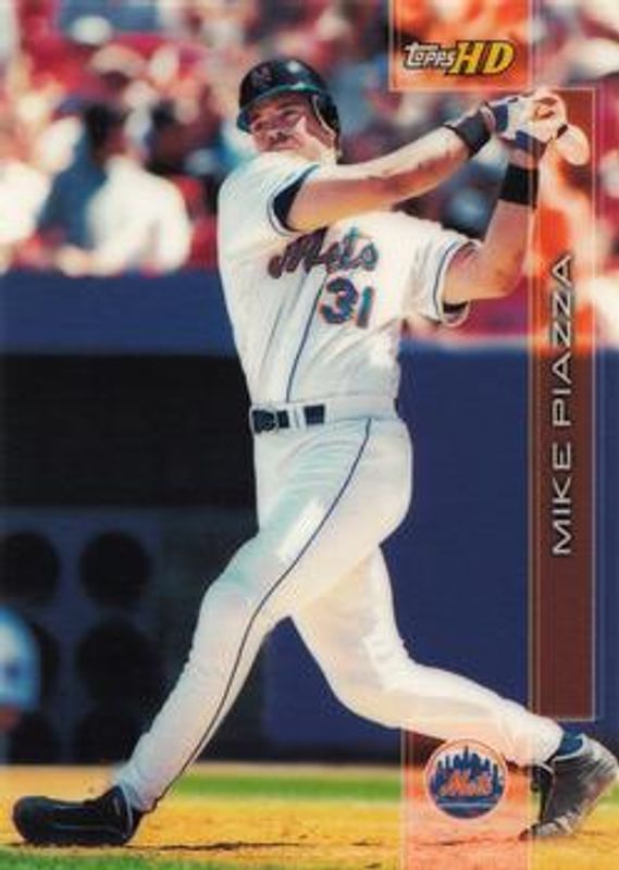 The Mike Piazza 2001 Topps High Definition (HD) #13 Base card is 1 of 6 Mike Piazza's card variations in the 2001 Topps High Definition (HD) set being tracked by Sports Card Investor, including #107 Base, #GD6 Game Defined, #GD6 Game Defined Aluminum, #107 Platinum /199, and #13 Platinum /199.