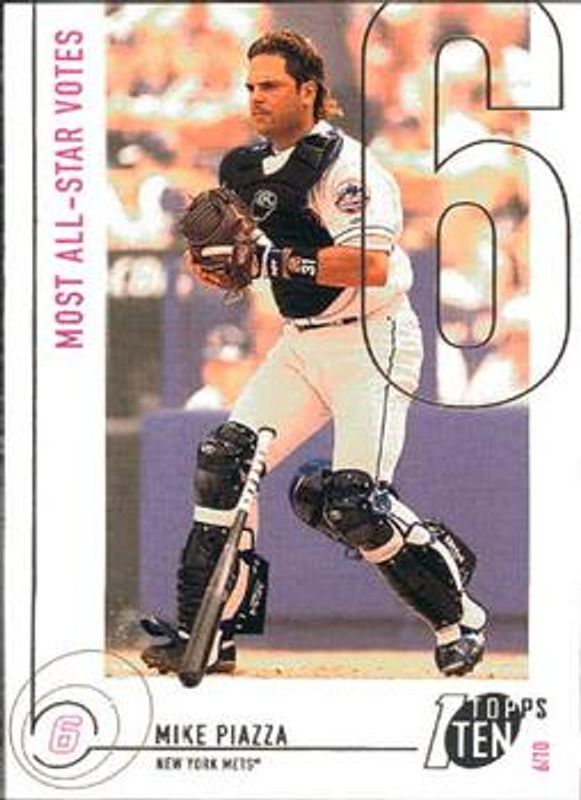 The Mike Piazza 2002 Topps Ten #107 Base card is 1 of 5 Mike Piazza's card variations in the 2002 Topps Ten set being tracked by Sports Card Investor, including #118 Base, #107 Die-Cut, #118 Die-Cut, and #TTR-MP Relics.