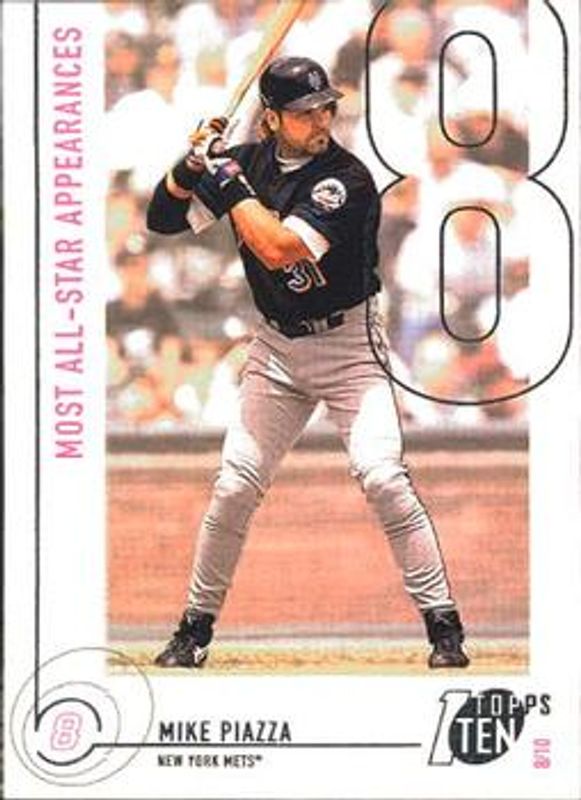 The Mike Piazza 2002 Topps Ten #118 Base card is 1 of 5 Mike Piazza's card variations in the 2002 Topps Ten set being tracked by Sports Card Investor, including #107 Base, #107 Die-Cut, #118 Die-Cut, and #TTR-MP Relics.