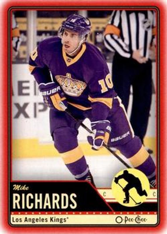 The Mike Richards 2012 O-Pee-Chee #104 Wrapper Redemption Red card is 1 of 7 Mike Richards' card variations in the 2012 O-Pee-Chee set being tracked by Sports Card Investor, including Base, Rainbow, Retro, Retro Blank Back, and Black Rainbow /100.