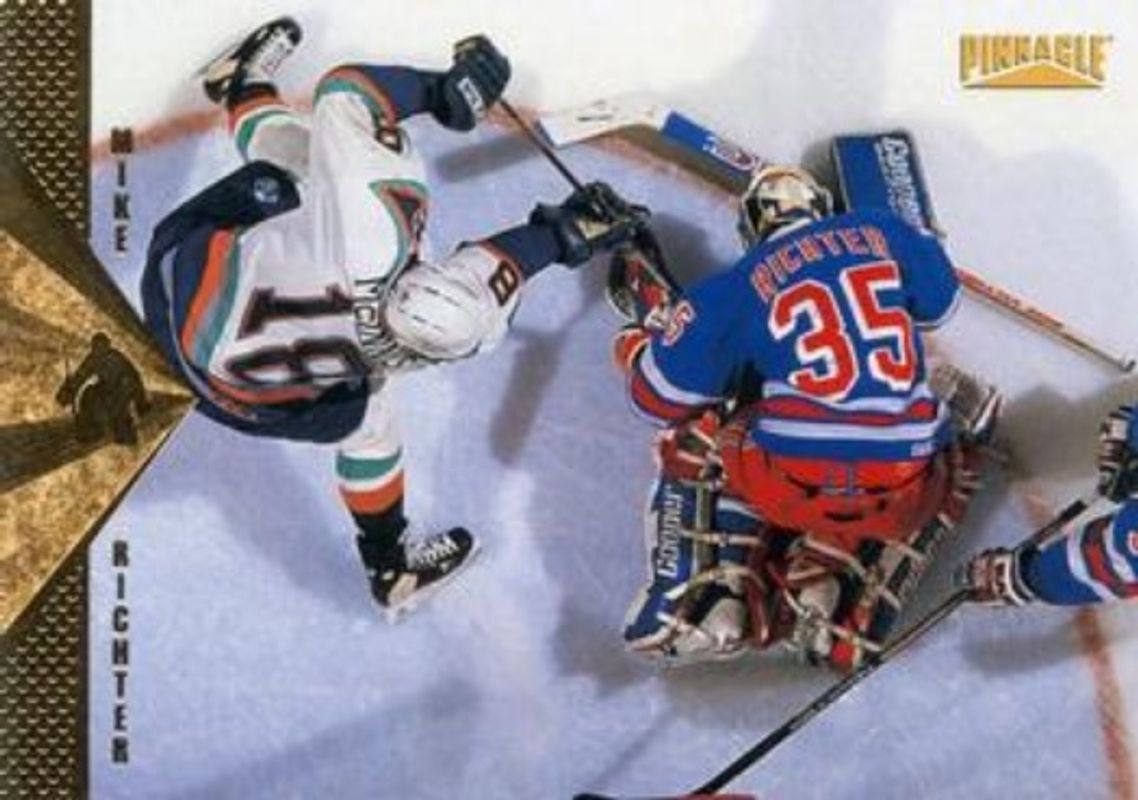 The Mike Richter 1996 Pinnacle #112 Base card is 1 of 8 Mike Richter's card variations in the 1996 Pinnacle set being tracked by Sports Card Investor, including Artist's Proofs, Foil, Premium Stock, Rink Collection, and FANtasy.