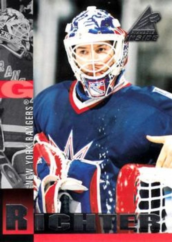 The Mike Richter 1997 Pinnacle Inside #81 Base card is 1 of 9 Mike Richter's card variations in the 1997 Pinnacle Inside set being tracked by Sports Card Investor, including Coaches Collection, Executive Collection, Cans, Cans - Gold, and Inside Track.
