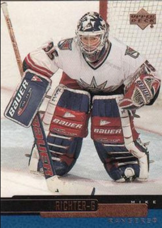 The Mike Richter 1999 Upper Deck #87 Base card is 1 of 9 Mike Richter's card variations in the 1999 Upper Deck set being tracked by Sports Card Investor, including UD Exclusives /100, UD Exclusives 1/1 /1, Gretzky Exclusive, Ultimate Defense, and Ultimate Defense Quantum Silver /100.