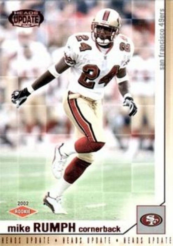 The Mike Rumph 2002 Pacific Heads Update #154 Red Rookie card is 1 of 3 Mike Rumph's card variations in the 2002 Pacific Heads Update set being tracked by Sports Card Investor, including Base, and Blue.