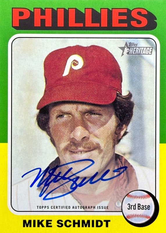 This card is 1 of 2 Mike Schmidt's card variations in the 2024 Topps Heritage set being tracked by Sports Card Investor, including Real One Autographs - Red Ink /75.