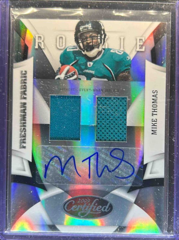 The Mike Thomas 2009 Donruss Certified #251 Base /250 card is 1 of 31 Mike Thomas' card variations in the 2009 Donruss Certified set being tracked by Sports Card Investor, including Mirror Blue /25, Mirror Gold /10, Mirror Emerald /5, Mirror Black /1, and Certified Potential /1000.