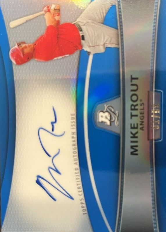 The Mike Trout 2010 Bowman Platinum #BPA-MT Prospect Autographs - Blue Refractor /99 Rookie card in Raw condition has moved up $300 (+50.0%) in the last 30 days and was last sold for $900.00 .