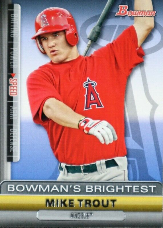 The Mike Trout 2011 Bowman #BBR6 Bowman's Brightest Rookie card in Raw condition has moved up $15.95 (+99.4%) in the last 30 days and was last sold for $32.00 .