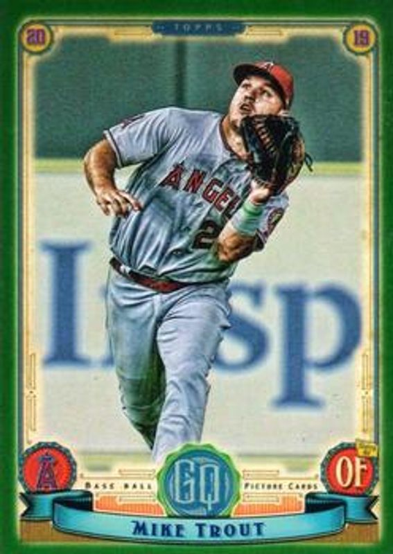 The Mike Trout 2019 Topps Gypsy Queen #1 Green card is 1 of 39 Mike Trout's card variations in the 2019 Topps Gypsy Queen set being tracked by Sports Card Investor, including #1c Base, #1b Base, #1 Base, #1 Bazooka Back, and #1b GQ Logo Swap.
