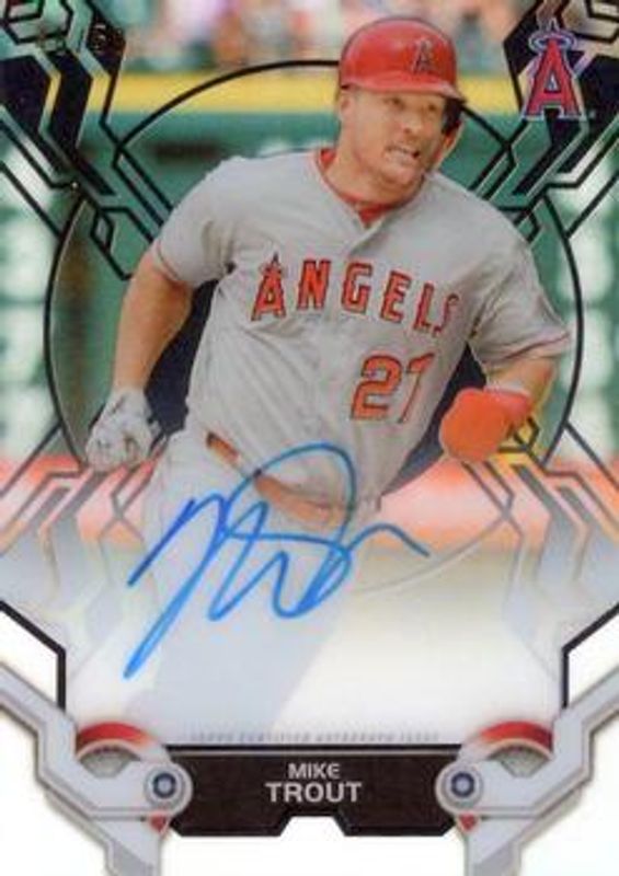 The Mike Trout 2019 Topps High Tek #HTA-MT Autographs card is 1 of 28 Mike Trout's card variations in the 2019 Topps High Tek set being tracked by Sports Card Investor, including Base, Blue, White, Green /150, and Purple /99.