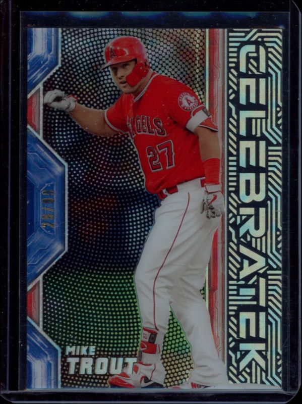 The Mike Trout 2019 Topps High Tek #CT-MT CelebraTEK /99 card is 1 of 28 Mike Trout's card variations in the 2019 Topps High Tek set being tracked by Sports Card Investor, including Base, Blue, White, Green /150, and Purple /99.