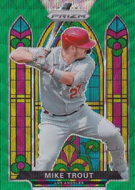 The Mike Trout 2021 Prizm #SG-1 Stained Glass - Green Wave card is 1 of 101 Mike Trout's card variations in the 2021 Prizm set being tracked by Sports Card Investor, including Base, Blue, Blue Velocity, Carolina Blue, and Cosmic Haze.