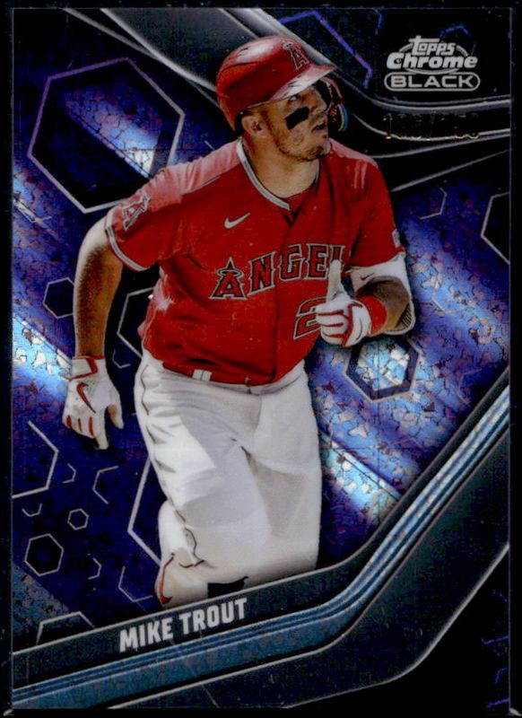 The Mike Trout 2023 Topps Chrome Black #100 Purple Mini Diamond Refractor /150 card is 1 of 25 Mike Trout's card variations in the 2023 Topps Chrome Black set being tracked by Sports Card Investor, including Base, Refractor /199, Green Refractor /99, Green Wave Refractor /99, and Blue Lava Refractor /75.