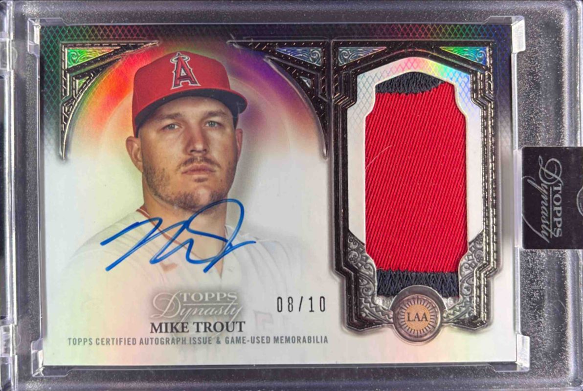 The Mike Trout 2023 Topps Dynasty #DAP-MT5 Base /10 card is 1 of 48 Mike Trout's card variations in the 2023 Topps Dynasty set being tracked by Sports Card Investor, including #ABGJ-MT Autographed Batting Gloves Jumbo Logo Variations, #ADR-MT Autographed Dual Relics, #AJP-MT Autographed Jumbo Patch, #ASEL-MT2 Autographed Special Event Baseball Leather, and #ASEL-MT1 Autographed Special Event Baseball Leather.