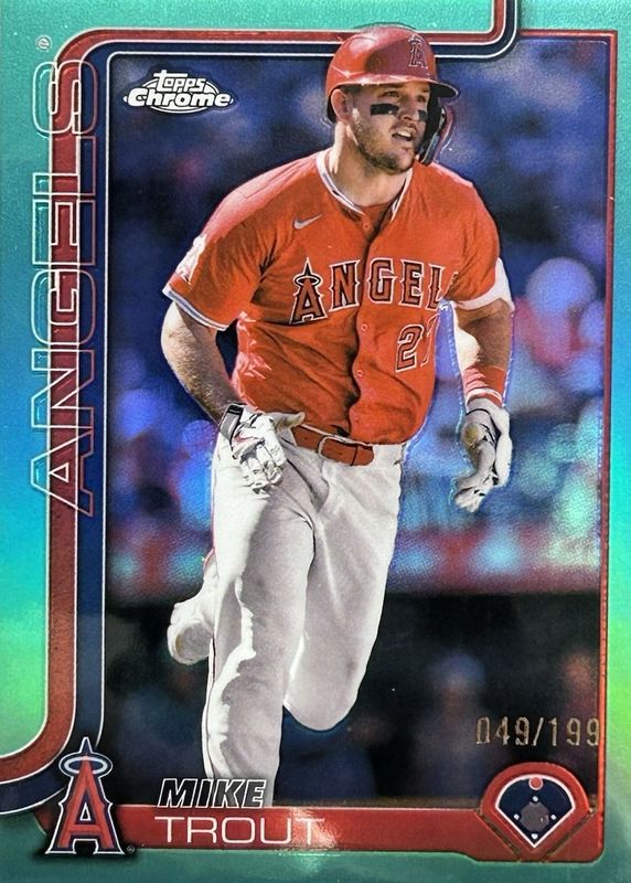 The Mike Trout 2025 Topps Chrome #100 Aqua Refractor /199 card in Raw condition has moved down -$2.00 (-25.0%) in the last 30 days and was last sold for $6.00 .