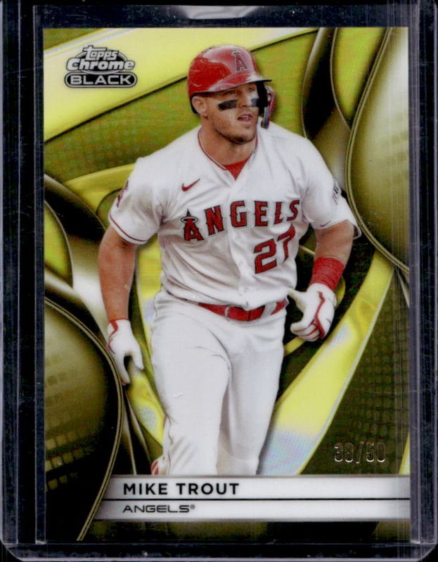The Mike Trout 2025 Topps Chrome Black #5 Gold Refractor /50 card is 1 of 39 Mike Trout's card variations in the 2025 Topps Chrome Black set being tracked by Sports Card Investor, including Base, Refractor /199, Blue Lava Refractor /150, Blue Refractor /150, and Green Refractor /99.