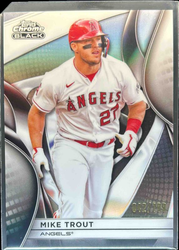 The Mike Trout 2025 Topps Chrome Black #5 Refractor /199 card is 1 of 39 Mike Trout's card variations in the 2025 Topps Chrome Black set being tracked by Sports Card Investor, including Base, Blue Lava Refractor /150, Blue Refractor /150, Green Refractor /99, and Green Wave Refractor /99.