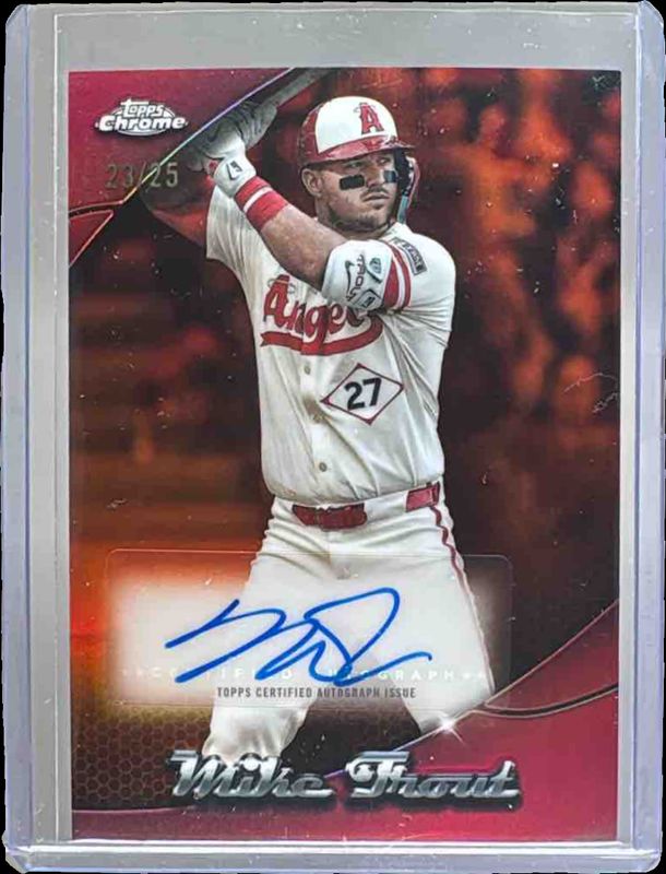 The Mike Trout 2025 Topps Chrome Update #CHRU-MT Chromeography - Orange Refractor /25 card is 1 of 88 Mike Trout's card variations in the 2025 Topps Chrome Update set being tracked by Sports Card Investor, including 1990 Topps Chrome, 1990 Topps Chrome Autographs, 1990 Topps Chrome - Geometric Refractor, Celebracion - Geometric Refractor, and Chromeography.