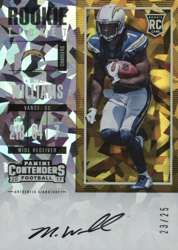 Mike Williams' Football cards are available in at least 162 sets. Mike Williams' biggest 7-day price movers are 2017 Contenders #325 Rookie Ticket Auto - Cracked Ice Ticket /25, 2018 Absolute #JNS-MW Jumbo NFL Shields Platinum Edition /1, and 2018 Absolute #STD-MW Tools of the Trade Double Autos /992.