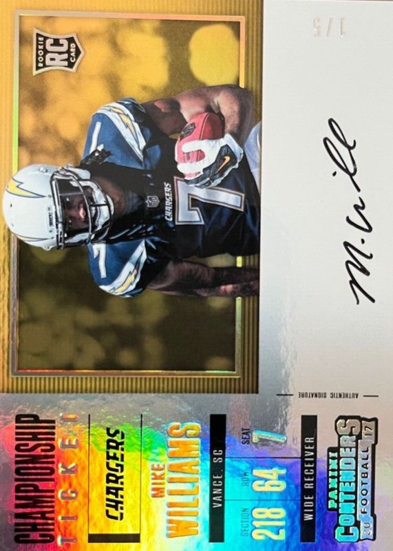 The Mike Williams 2017 Contenders #365 Rookie Ticket Auto Variation - Championship Ticket (/5) card in Raw condition has not changed in price in the last 30 days and was last sold for $20.00 .